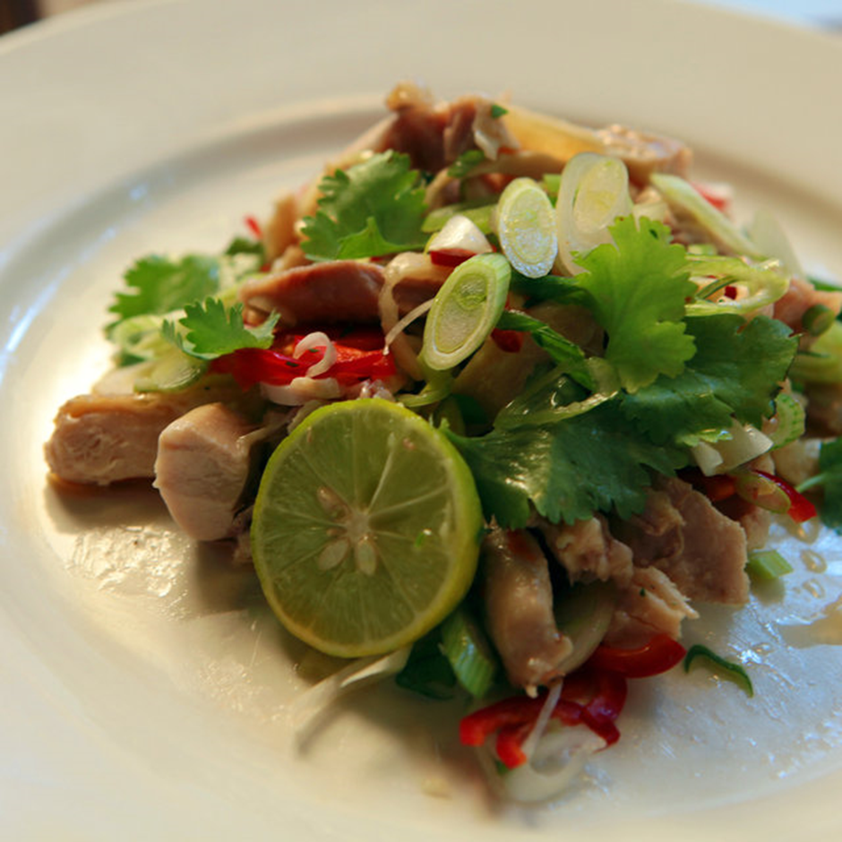 The second dish was boiled chicken[2]. There were only three pieces of tender yellow chicken in each serving. In addition to these three pieces, there were bamboos made of cucumber peels on the porcelain white plate, which were particularly fresh and green.
