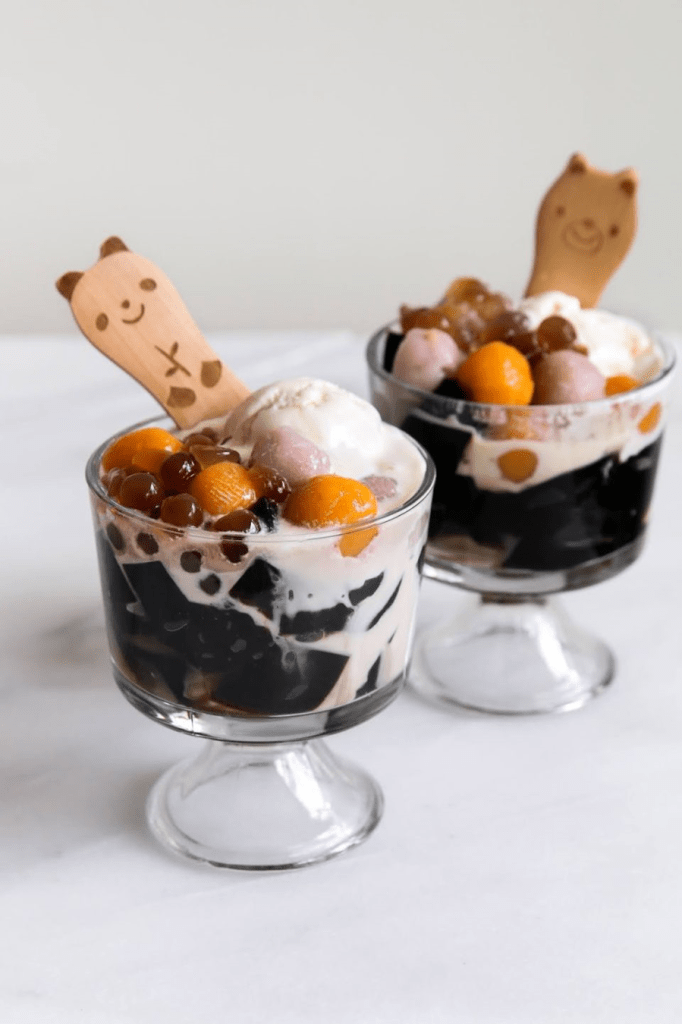 Xiao Yao thought and looked away. There were only two girls left in the queue in front of him, who were huddled side by side. Next up was what he ordered for Old Dog Bai, a mango and taro ball milk ice[1], a blueberry and coconut milk sago[2]; and a bowl of lovely bright red candied cherries[3].